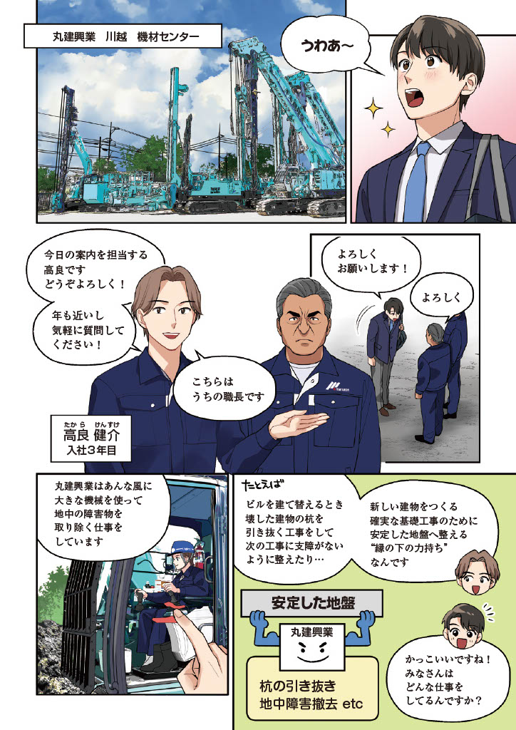 基礎工事の中でも「既存の杭(くい)の引抜き工事」、「地中障害の撤去工事」、「山留工事」といった、建物を立てる前の地盤を整える仕事をしている丸建興業。工事にあたり各職種がどんな仕事をしているのかをご紹介します。