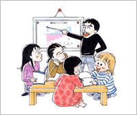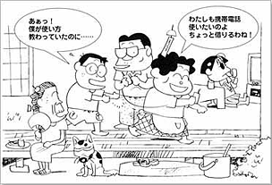 家族キャラが携帯電話の使いこなし術をシナリオ仕立てで紹介しています。